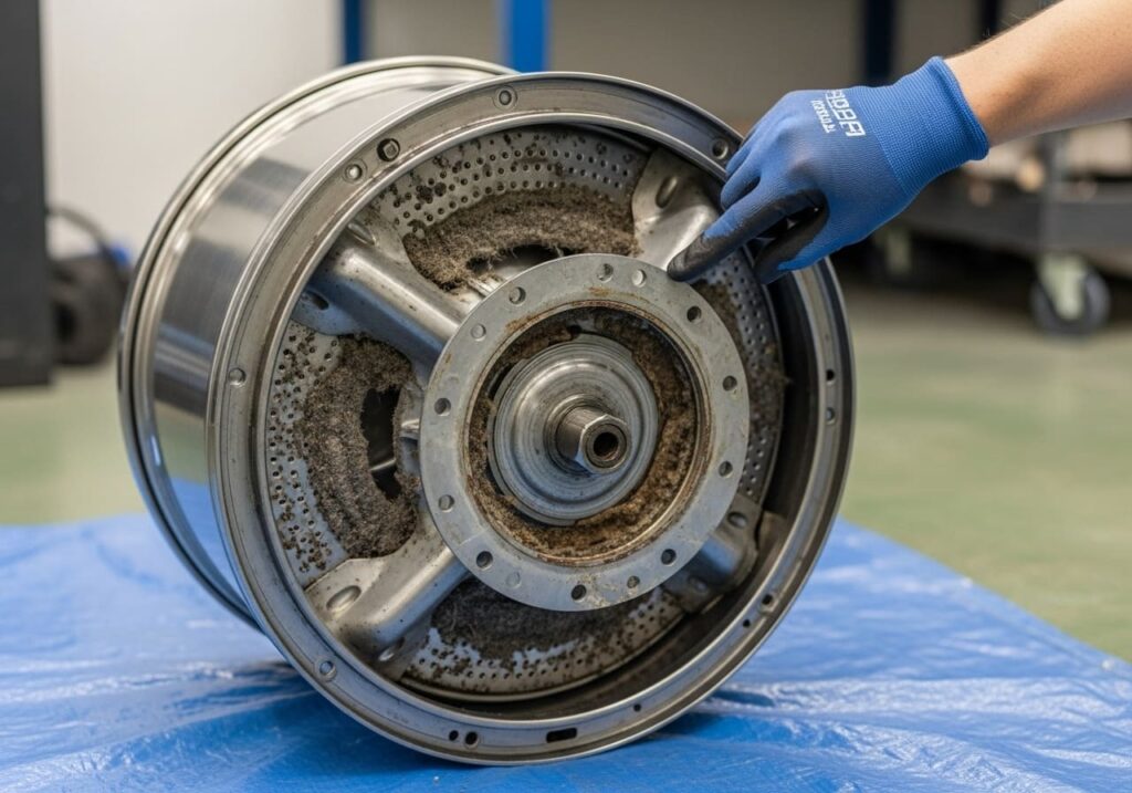 洗濯槽の底面を支える金属パーツ「フランジ(スパイダー)」は、複雑なハニカム構造をしており、洗剤カスが石のように硬く固着しやすい場所です。