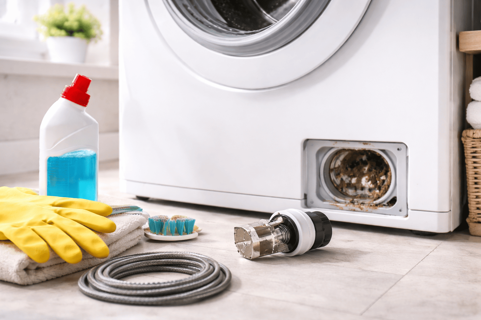洗濯機周りから下水のような臭いがする場合、排水口と排水ホースの掃除が不可欠です。排水口の内部にある「排水トラップ」は、汚れが溜まりやすく、悪臭の発生源となりやすい場所です。