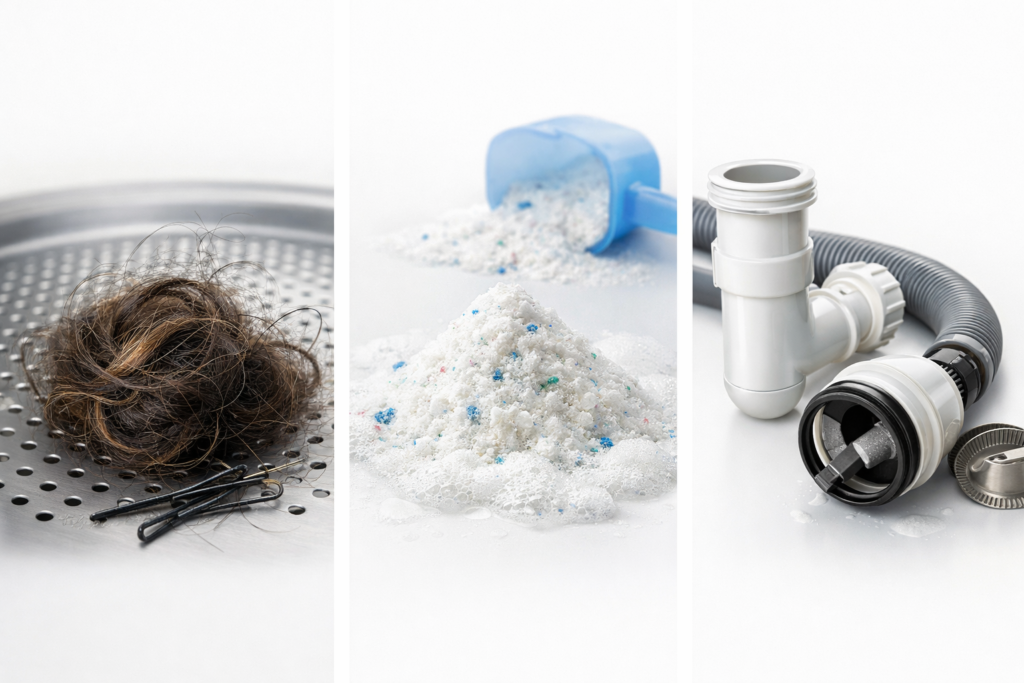 洗濯物のポケットに入っていた小銭やヘアピン、子どもの小さなおもちゃ、気付かずに落としてしまったアクセサリーなどが、排水口や排水トラップに詰まっているケースです。パイプユニッシュは髪の毛や皮脂などの有機物は溶かせますが、金属やプラスチックなどの固形物は分解できません。